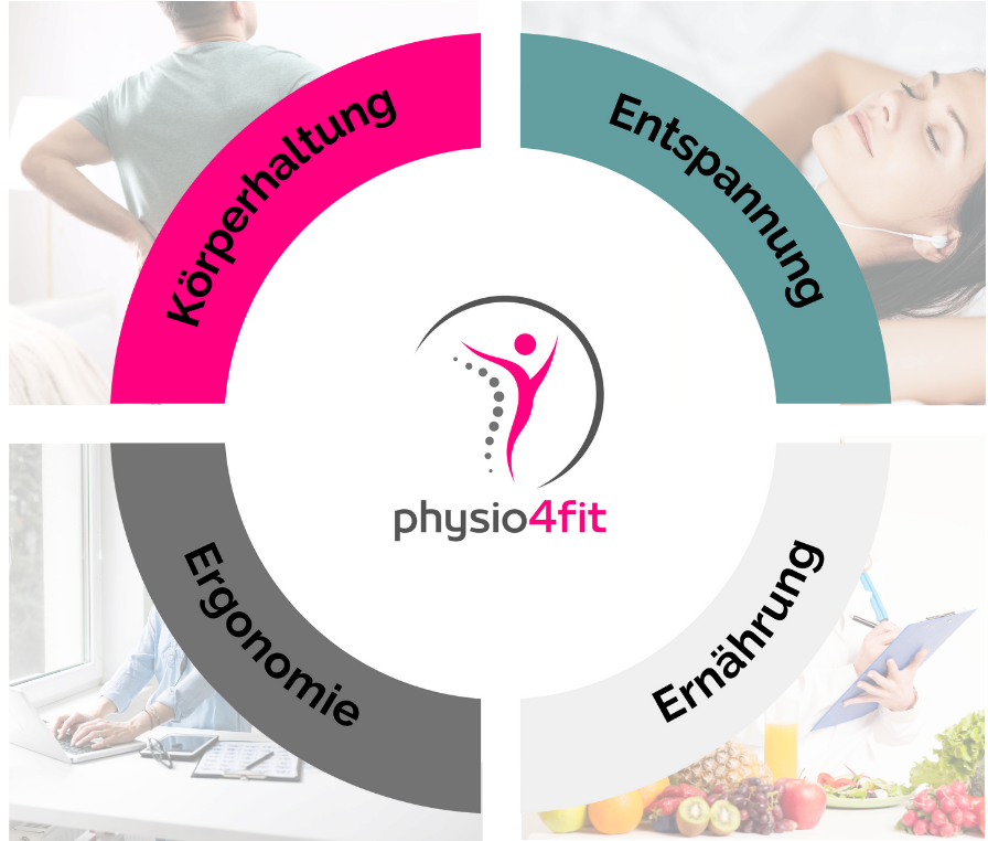 Bei physio4fit setzen wir auf die vier entscheidenden Bausteine, die gemeinsam über deine Schmerzfreiheit entscheiden: Körperhaltung, Entspannung, Ernährung und Ergonomie.