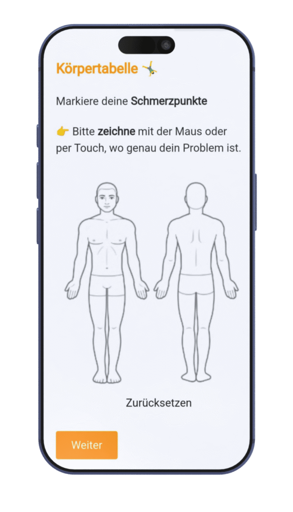 Durch die individuelle Analyse wird der Plan auf deine persönliche Situation abgestimmt – unabhängig davon, ob deine Beschwerden eher im unteren Rücken, Nacken oder in anderen Bereichen auftreten.